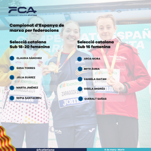 Repassem els integrants de la selecció catalana. Possiblement, l’equip més complet sigui el sub 18-20 femení. L’equip el conformen, una campiona d’Europa, com Sofia Santacreu, una campiona d’Espanya, com Gina Torres, la temporada passada amb Catalunya, una altra atleta internacional com Júlia Suàrez, i dues atletes com Clàudia Sànchez i Marta Jiménez.